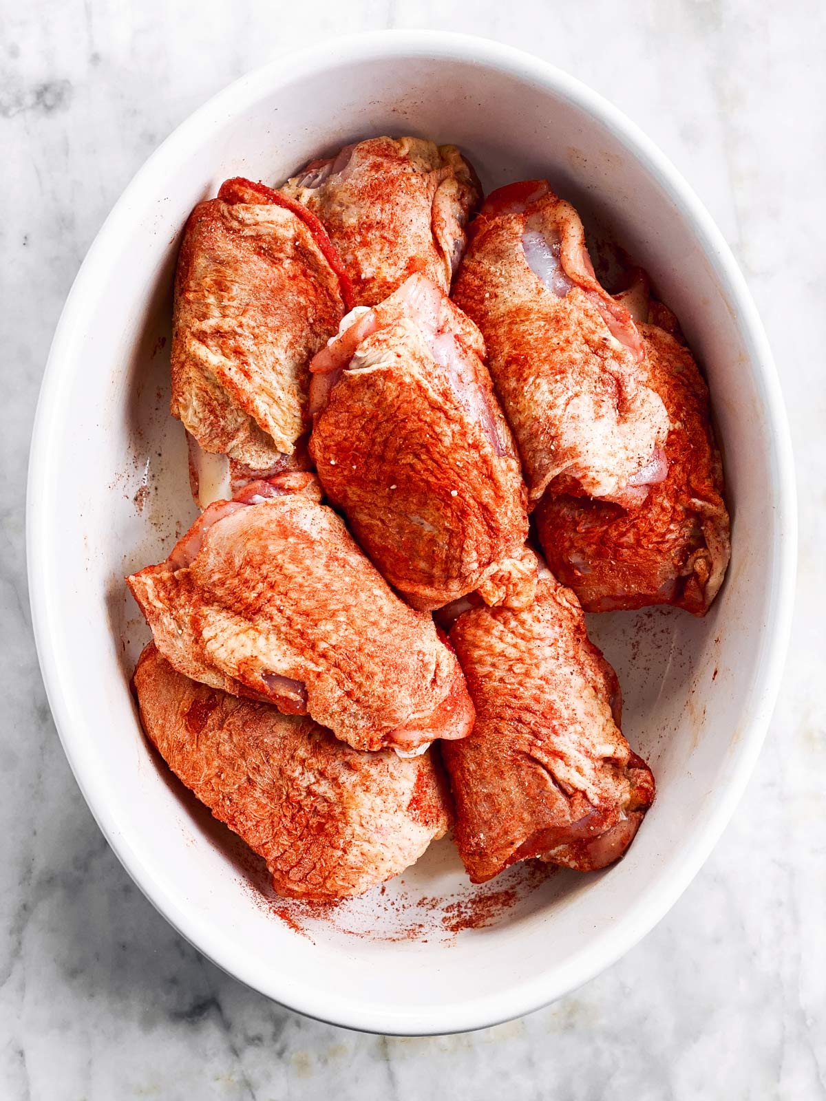- Combine ground paprika, onion an garlic powder, salt and pepper. Rub all over the chicken thighs.