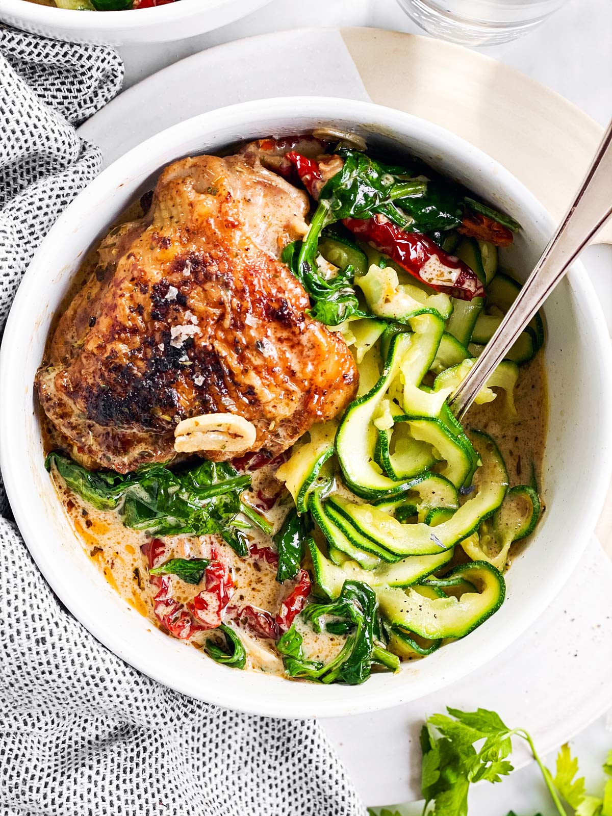 I think Tuscan chicken is often served with pasta in regular meals, so I like to add a side of zucchini ribbons to mine for s-meals/low carb meals!