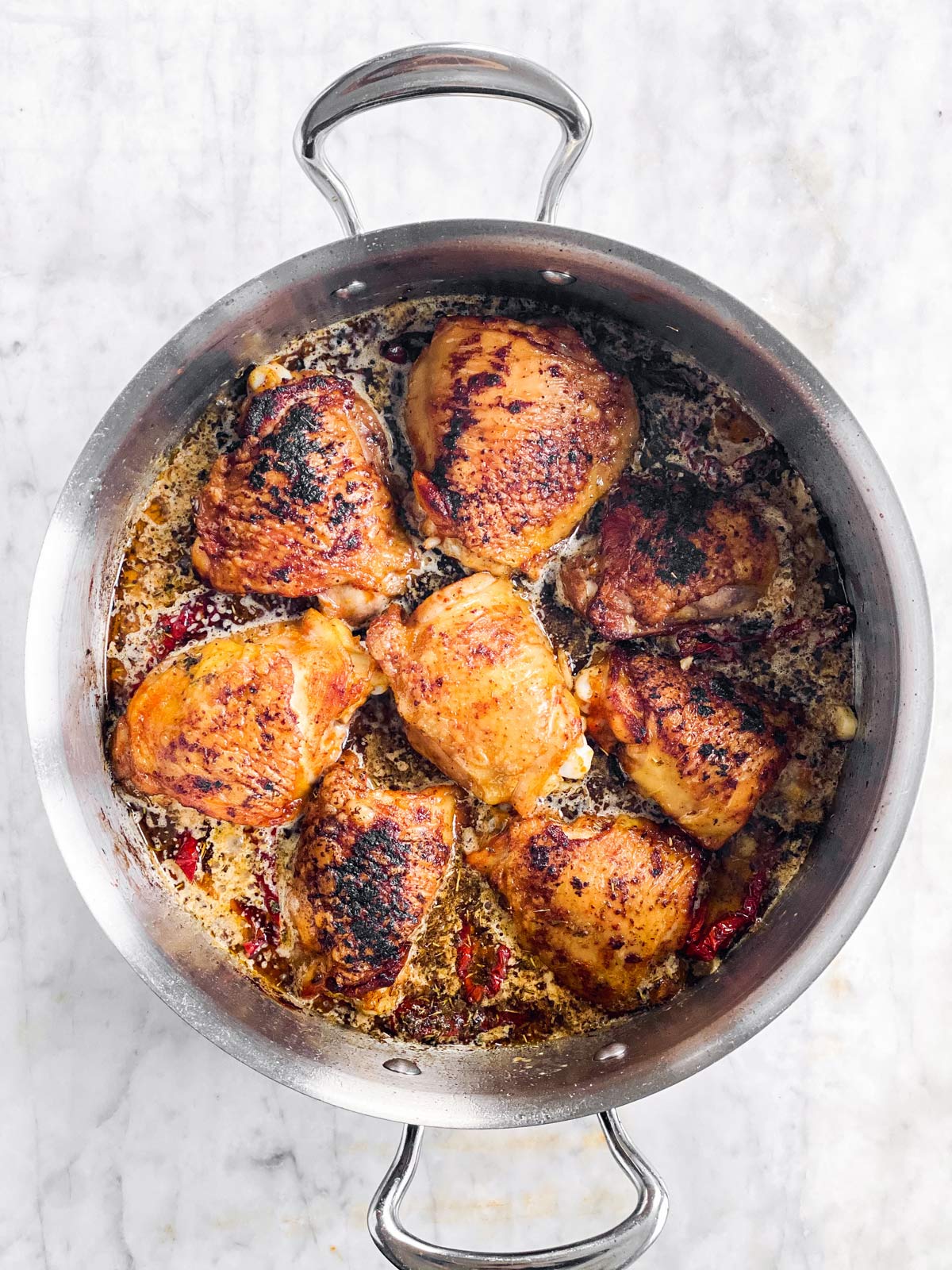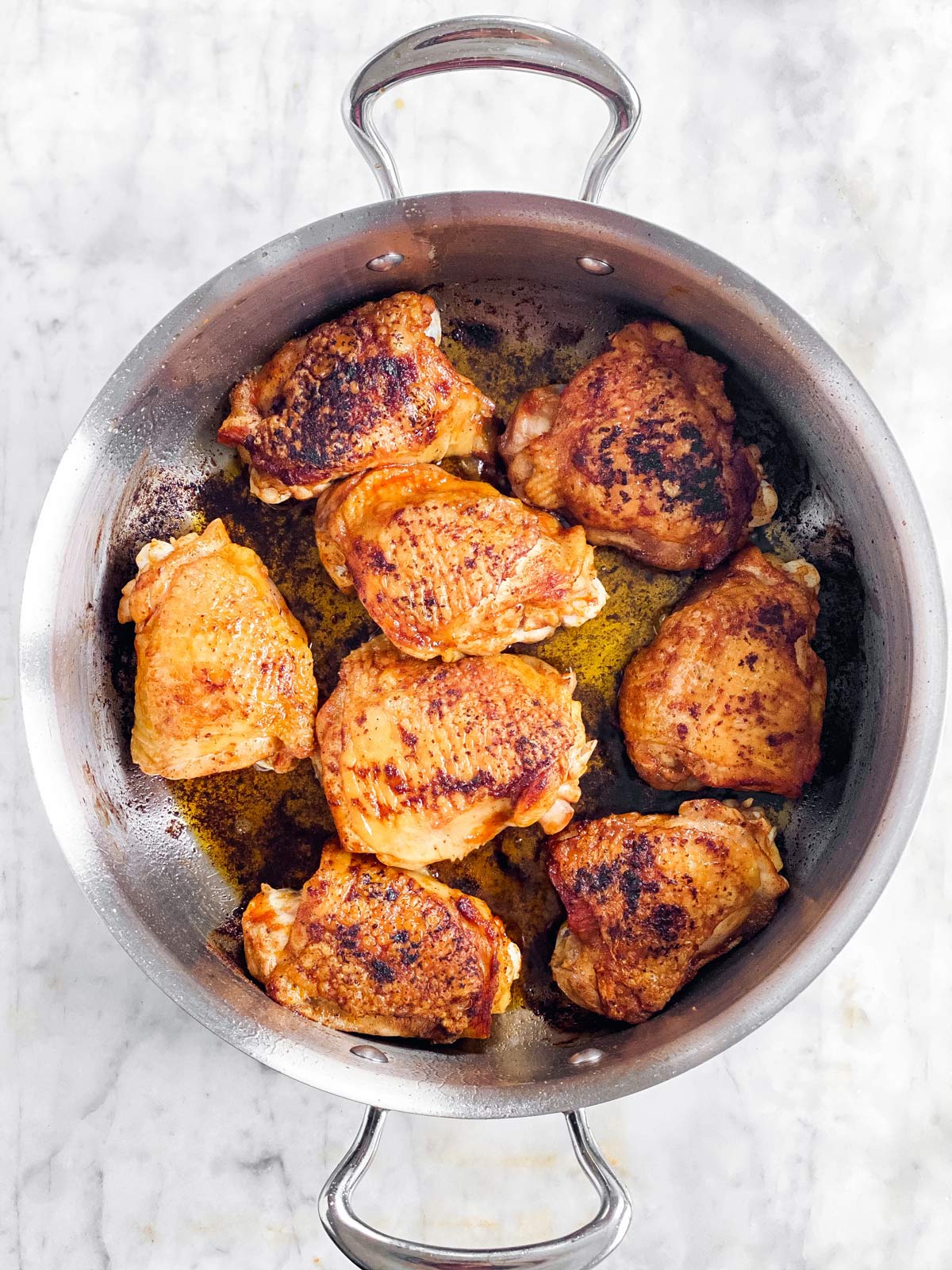 - Do not skip browning the chicken – it brings out so much flavor and really enhances the texture of the chicken skin, too. Keep in mind, you don’t need to cook through the chicken yet, you just need to brown and crisp up the outside. The inside will finish cooking in the oven.