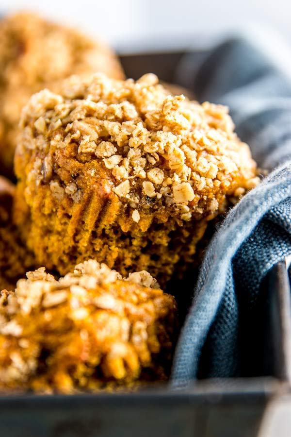 ► 5 Bake the muffins: If you want to add the optional streusel topping, do so now – it’s just oats, pecans and pumpkin spice crumbled together with a little butter. Then bake the muffins for around 25 minutes, or until a toothpick inserted into the middle comes out just clean.