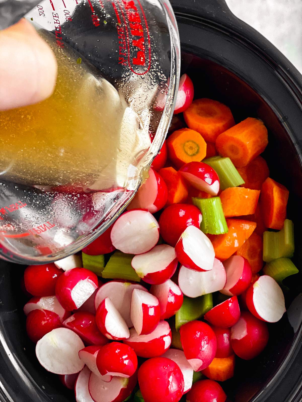 - Radishes: I used pink baby radishes, the lose a lot of their color during cooking and look more like white baby potatoes in the end. You can also use a large white radish or Daikon and dice it up if that’s all you can find.