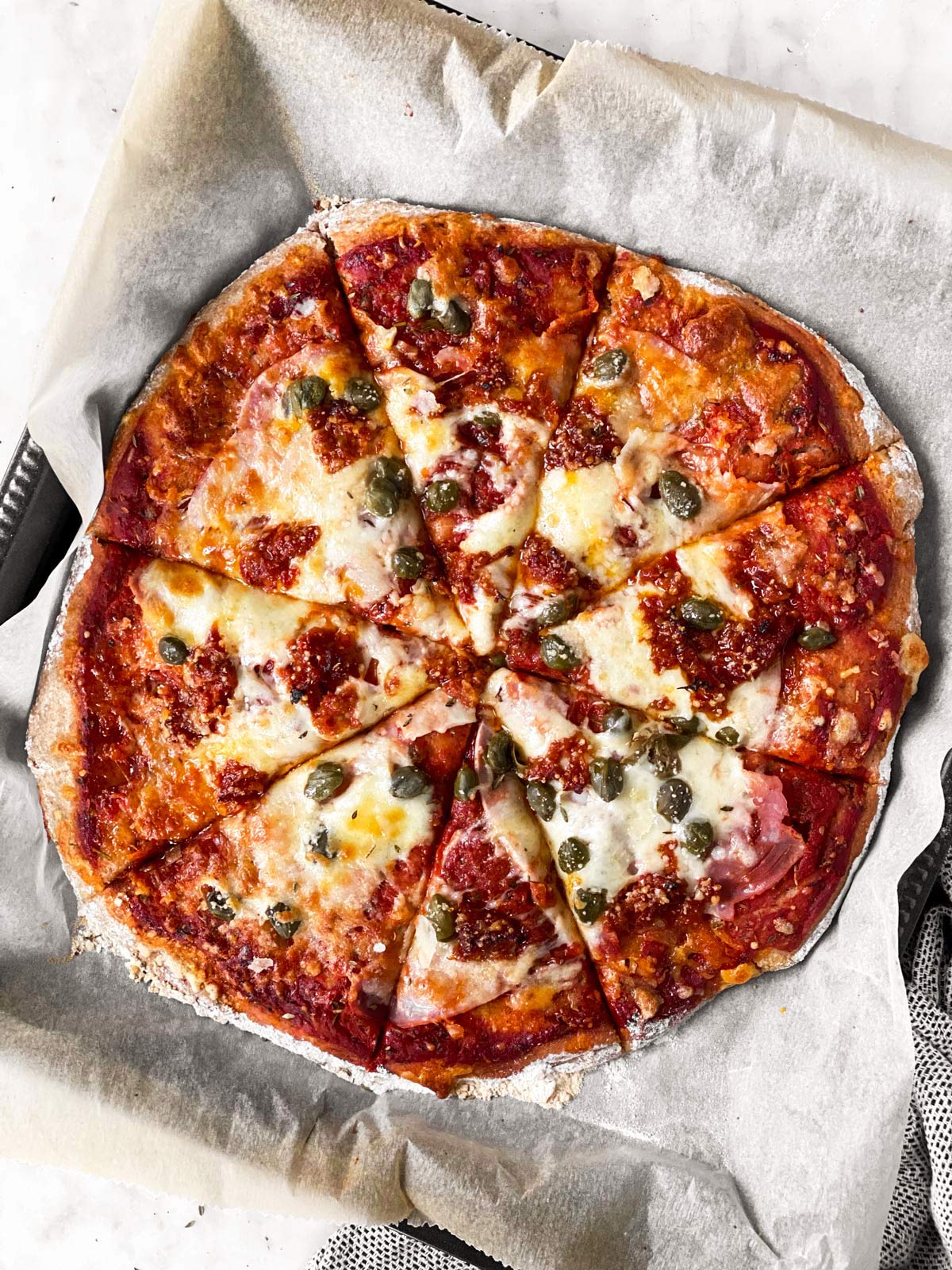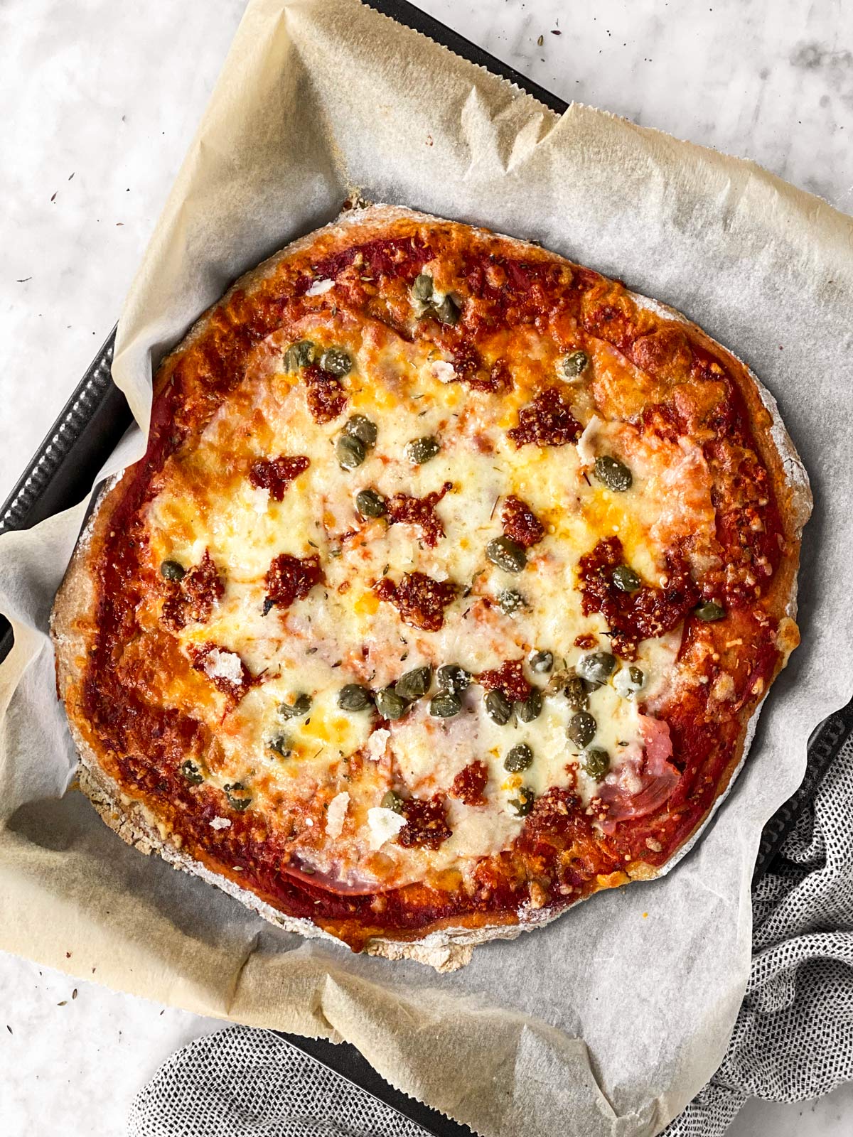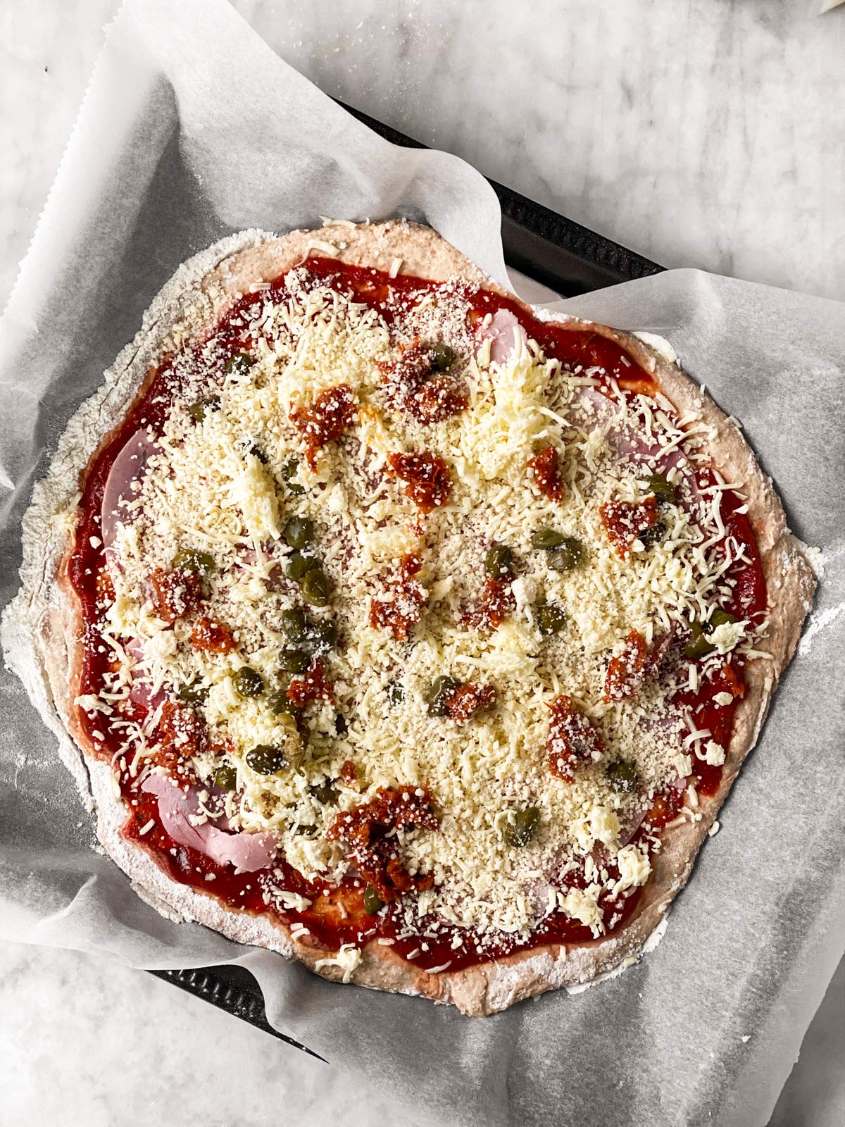 - For the photos I used a wild mix of stuff I found in the fridge 😅 Tomato sauce, organic ham, mozzarella and parmesan cheese, capers and sun-dried tomato pesto.