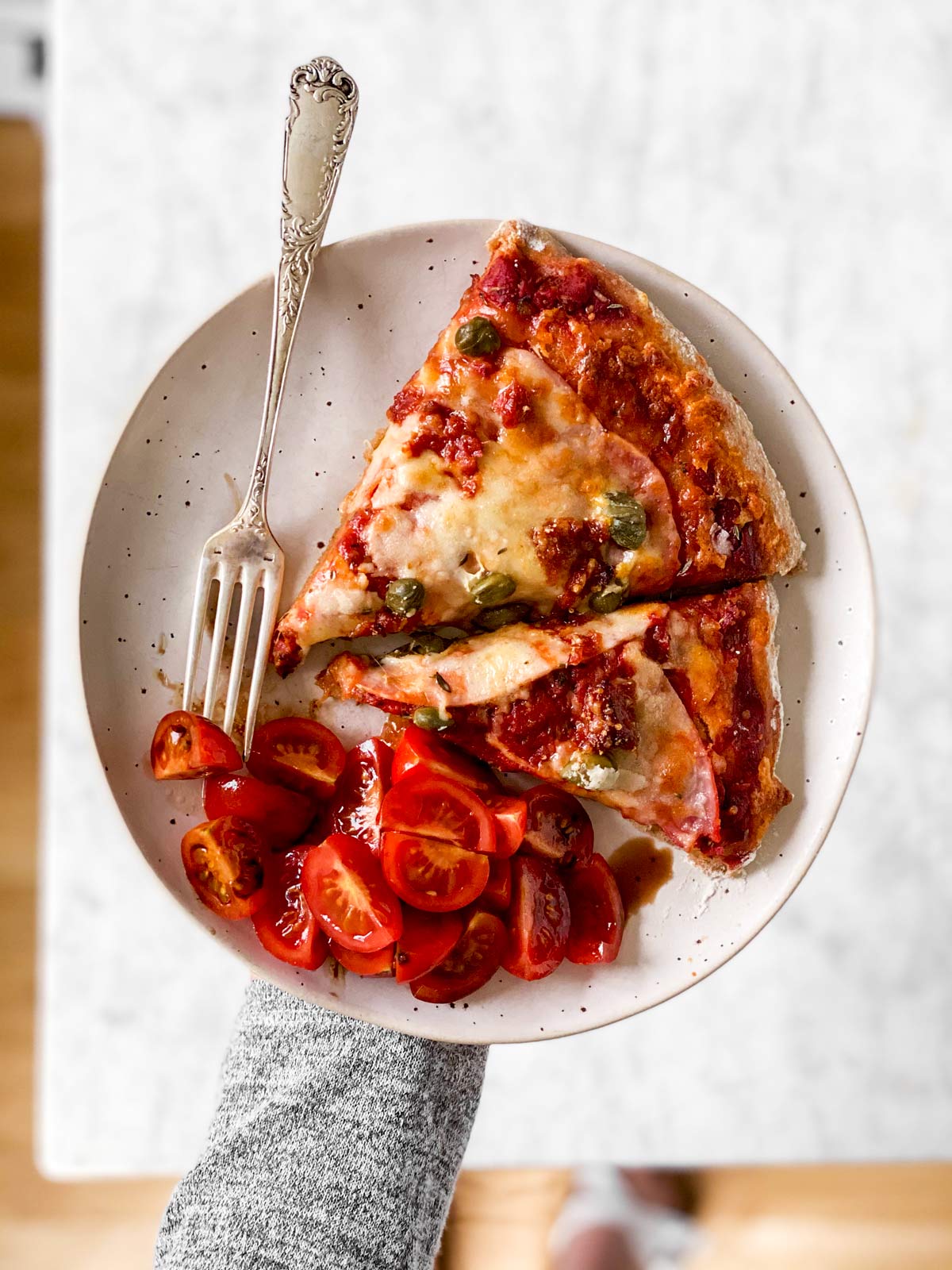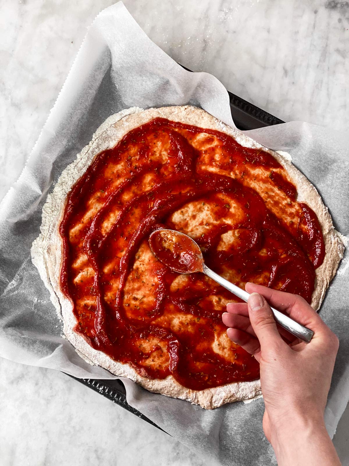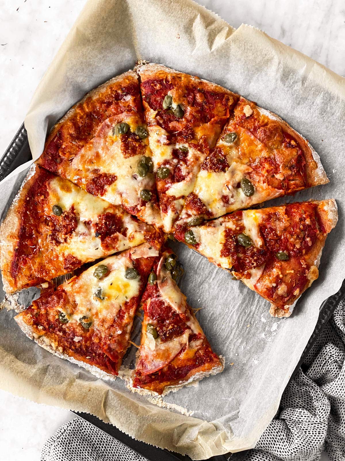 - For the photos I used a wild mix of stuff I found in the fridge 😅 Tomato sauce, organic ham, mozzarella and parmesan cheese, capers and sun-dried tomato pesto.