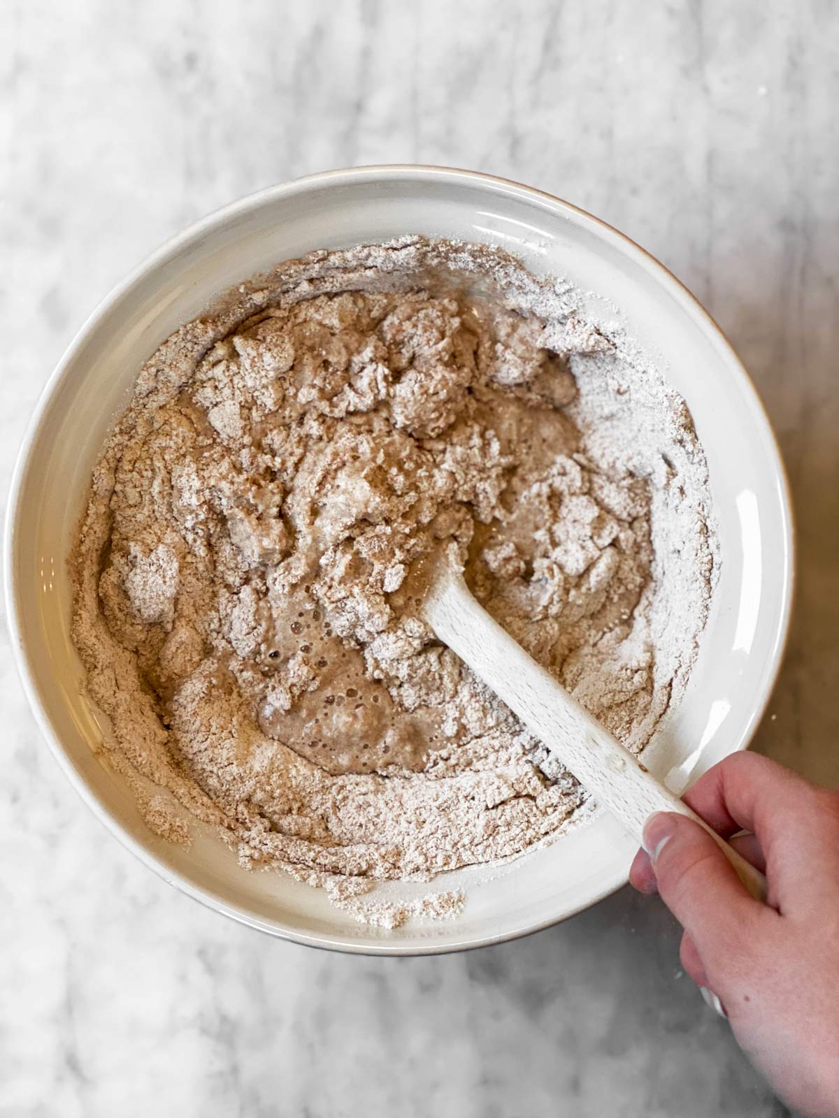- Pour bubbly yeast mixture into the bowl with the flour mixture. Using a wooden spoon, stir until combined into a scraggly, lumpy, sticky dough.