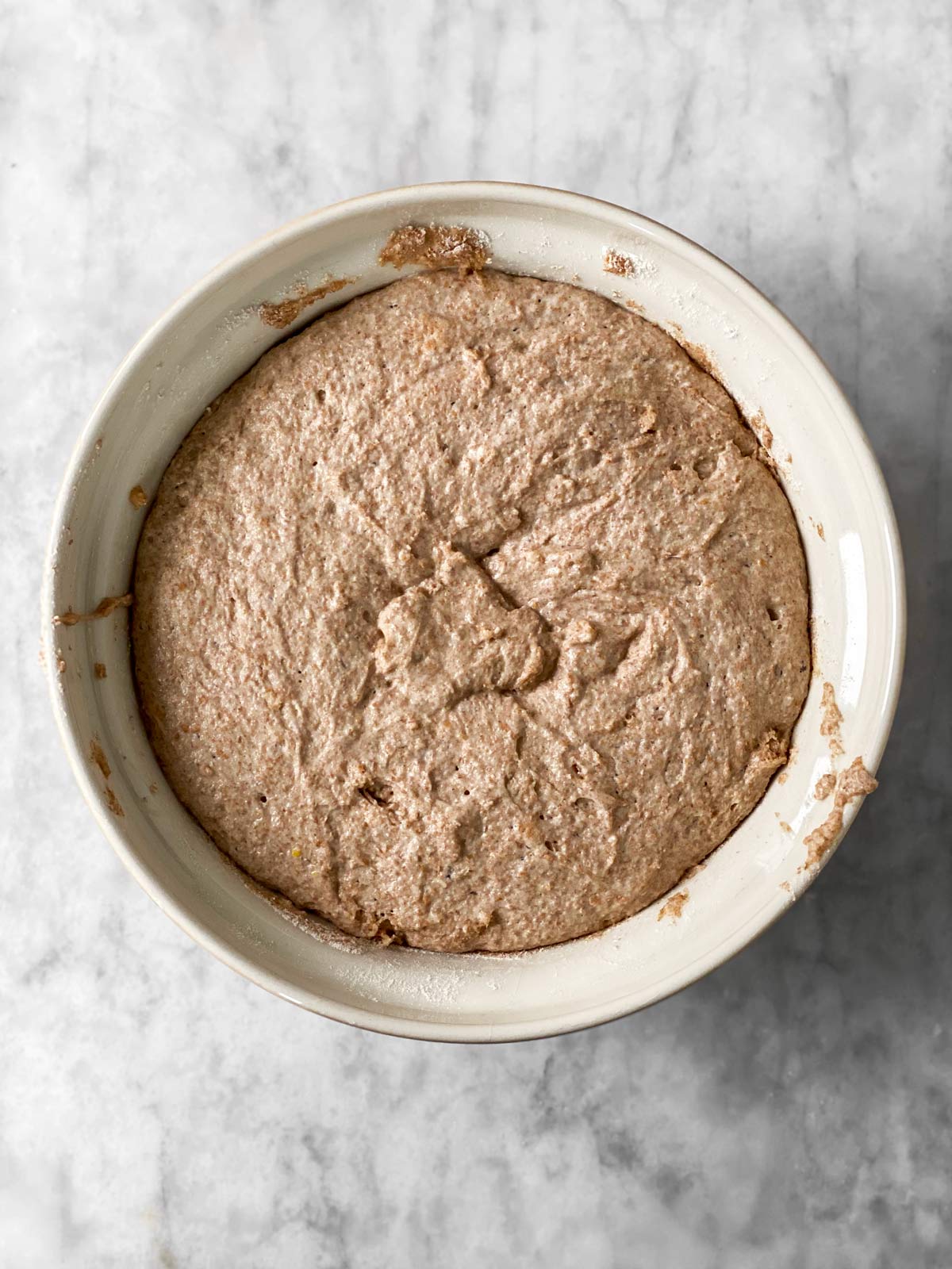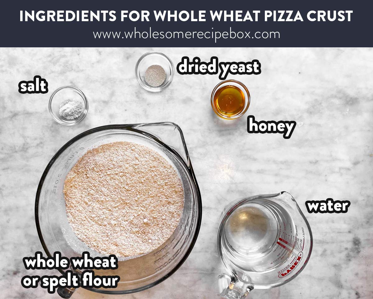 - 4.5 cups store-bought whole wheat or whole spelt flour OR 5 – 5.5 cups freshly milled wheat or spelt (530g); plus extra for dusting