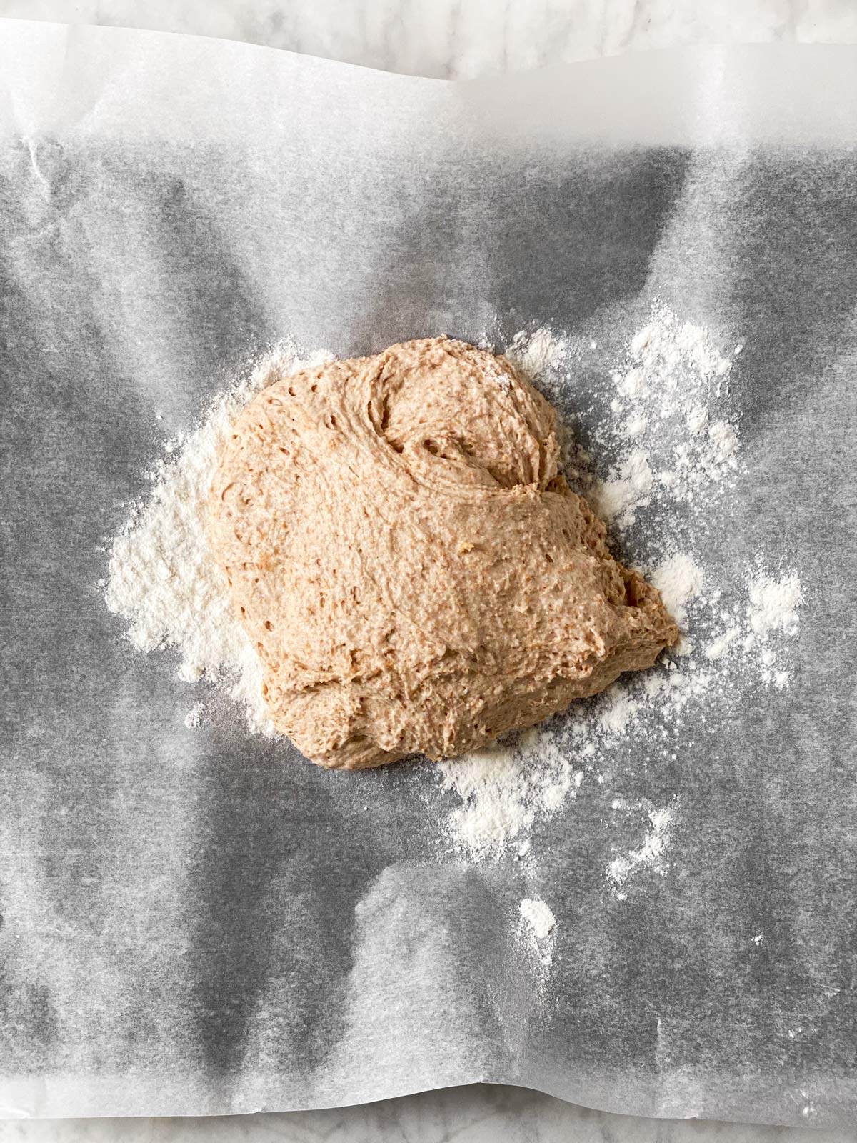 4. You’ll want to generously flour a lined baking sheet (I used sifted flour for the photos for better contrast, I would usually just use whole). Drop half the risen dough on the pan and generously sprinkle with flour.