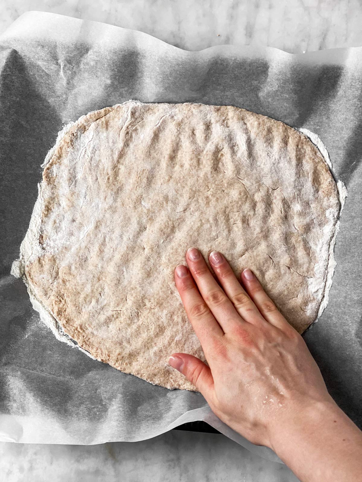 - Use enough flour both on the lined pan and on top of the dough when pressing into a circle. Do not attempt to use a rolling pin, it won’t work. Pressing into a circle by hand is quick and easy once you get the hang of it!